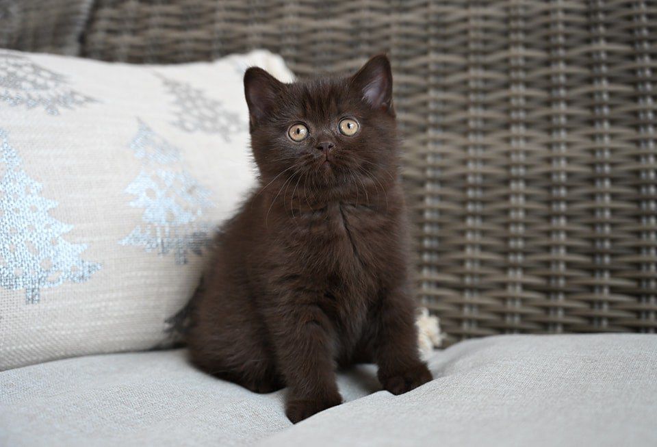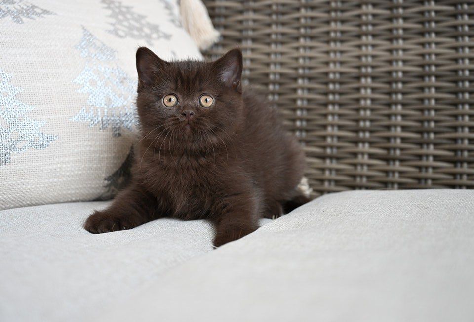 Meet Espresso! ☕ For those who appreciate luxury, this exceptional Self Chocolate British Shorthair kitten is a must-see. His coat is a deep, velvety brown—a rare and coveted color—with the characteristic chunky BSH build. Espresso is a calm, stable, and truly affectionate cat breed, ready to be the perfect purebred shorthair centerpiece of your home. His striking copper eyes command attention!